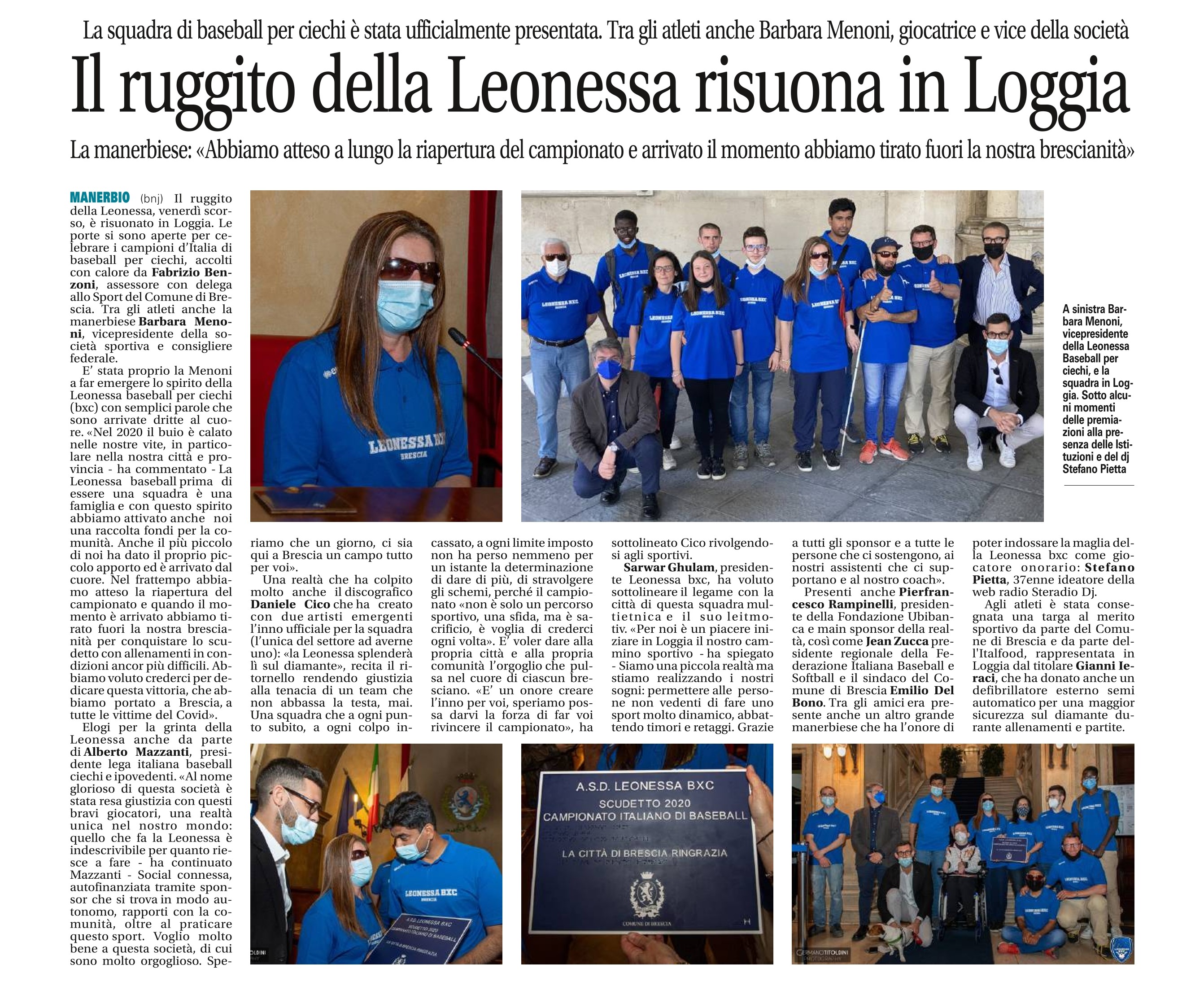 MANERBIO (bnj) Il ruggito della Leonessa, venerdì scorso, è risuonato in Loggia. Le porte si sono aperte per celebrare i campioni d’Italia di baseball per ciechi, accolti con calore da Fabrizio Benz oni, assessore con delega allo Sport del Comune di Brescia. Tra gli atleti anche la manerbies e Barbara Menoni, vicepresidente della società sportiva e consigliere fe derale.